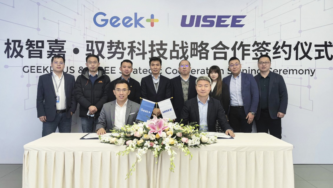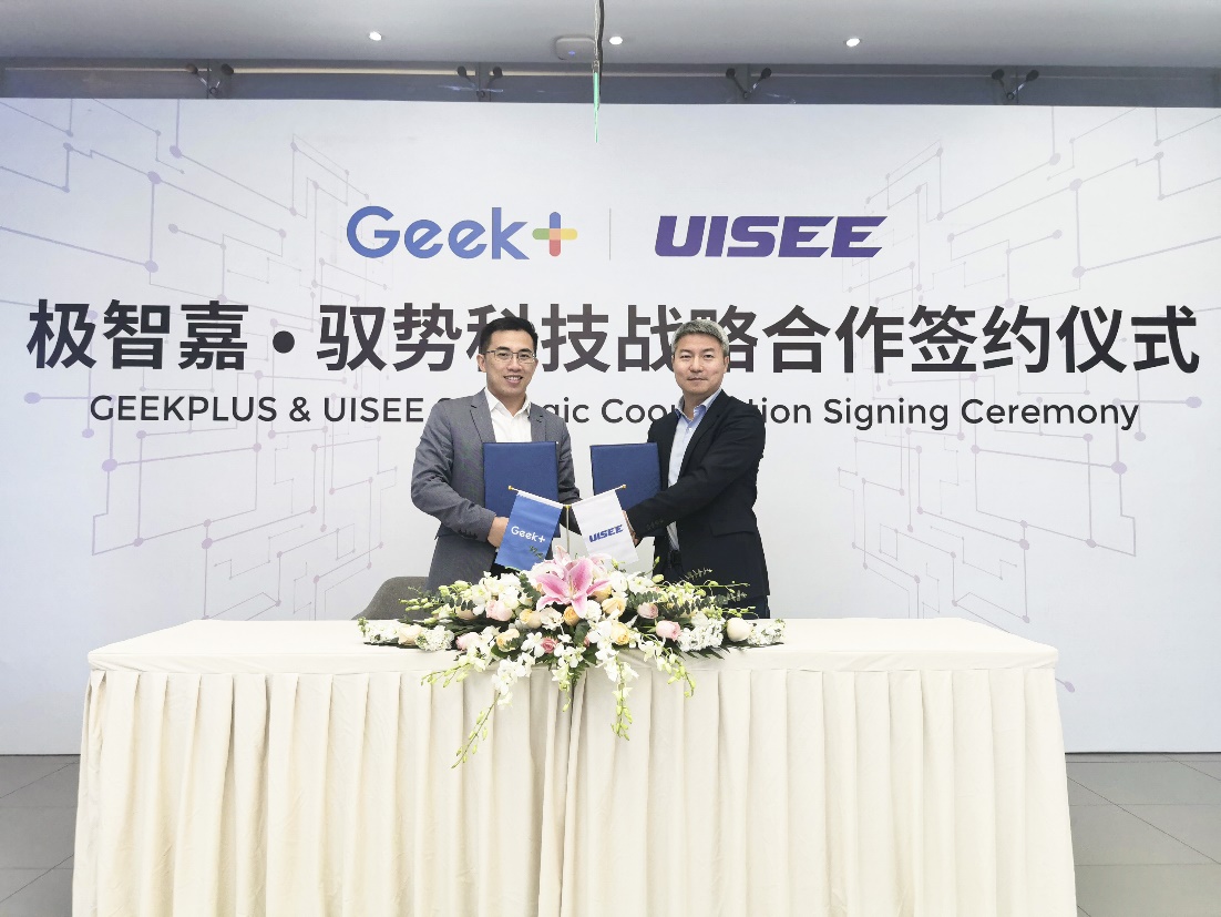 极智嘉CEO郑勇 (左) 与驭势科技联合创始人兼董事长、CEO吴甘沙 (右) 在北京正式签署战略合作协议