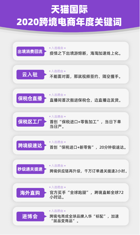 12月30日,天猫国际发布2020跨境电商年度关键词:出境消费回流、云入驻、保税仓直播、保税区工厂、跨境极速达、秒级通关提速、海外直购、进博会等入选。