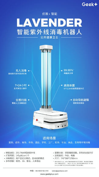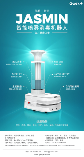 面对后疫情时代的无人化消毒需求,极智嘉 (Geek+) 积极践行“科技向善”的理念,充分发挥强大研发实力和前沿智能机器人技术优势,重磅推出两款智能消毒机器人——智能紫外线消毒机器人Lavender和智能喷雾消毒机器人Jasmin,以AI机器人助力公共场所消毒工作,守护公众健康。